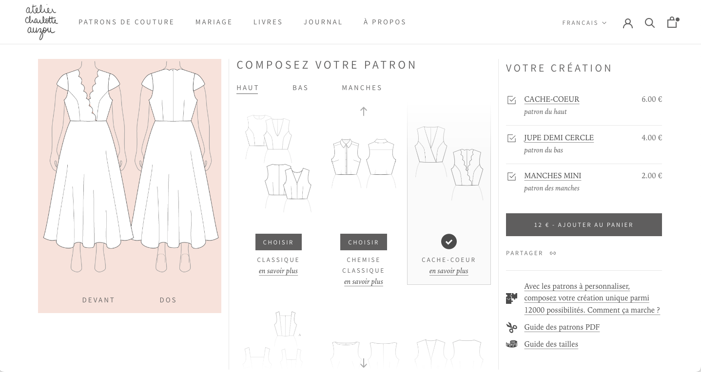 Les patrons à personnaliser ne peuvent être cousus seuls. Vous devez en choisir au moins deux (un haut + un bas) pour obtenir les étages de montage complètes. Si vous souhaitez coudre une jupe, téléchargez le bonus "Juste le bas" afin de suivre les 9 chapitres d'assemblage dans l'ordre.