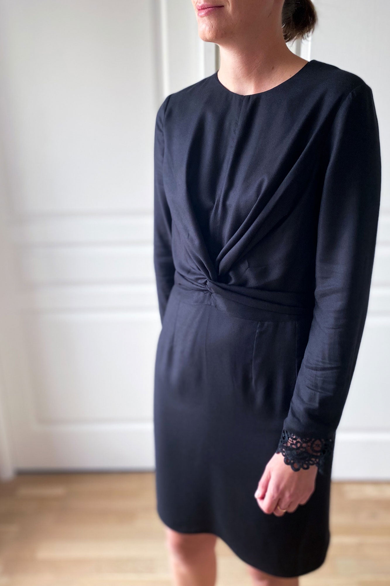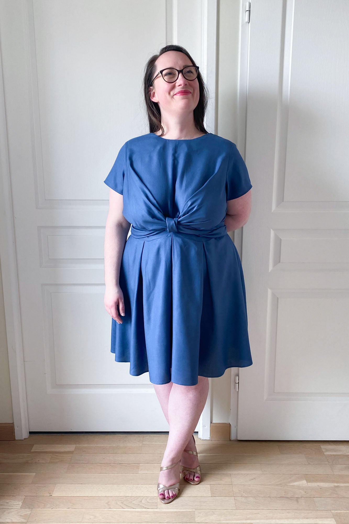 Le patron de couture "Liens twistés" permet de coudre une robe ou une combinaison cintrée à la taille grâce à deux liens intégrés sur le devant. À personnaliser avec les bas pour créer une robe ou une combinaison.